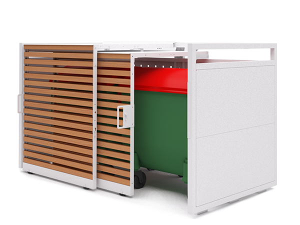 Den særlige funktion ved denne indhegning er det skyde tag, som åbner samtidig med døren, hvilket gør det muligt at åbne låget på beholderne uden hindringer.