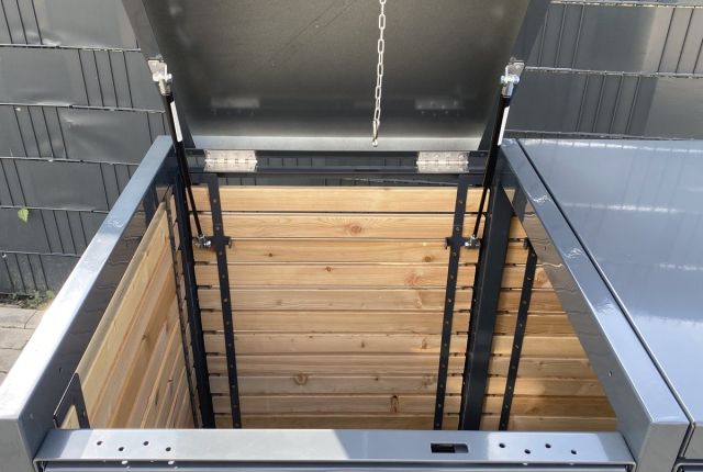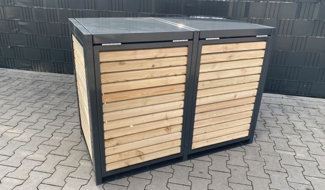 Skjuler til 2 skraldespande med lamellook i træ, samt klaptag og vippefunktion. Ramme samt fladt tag i metal.